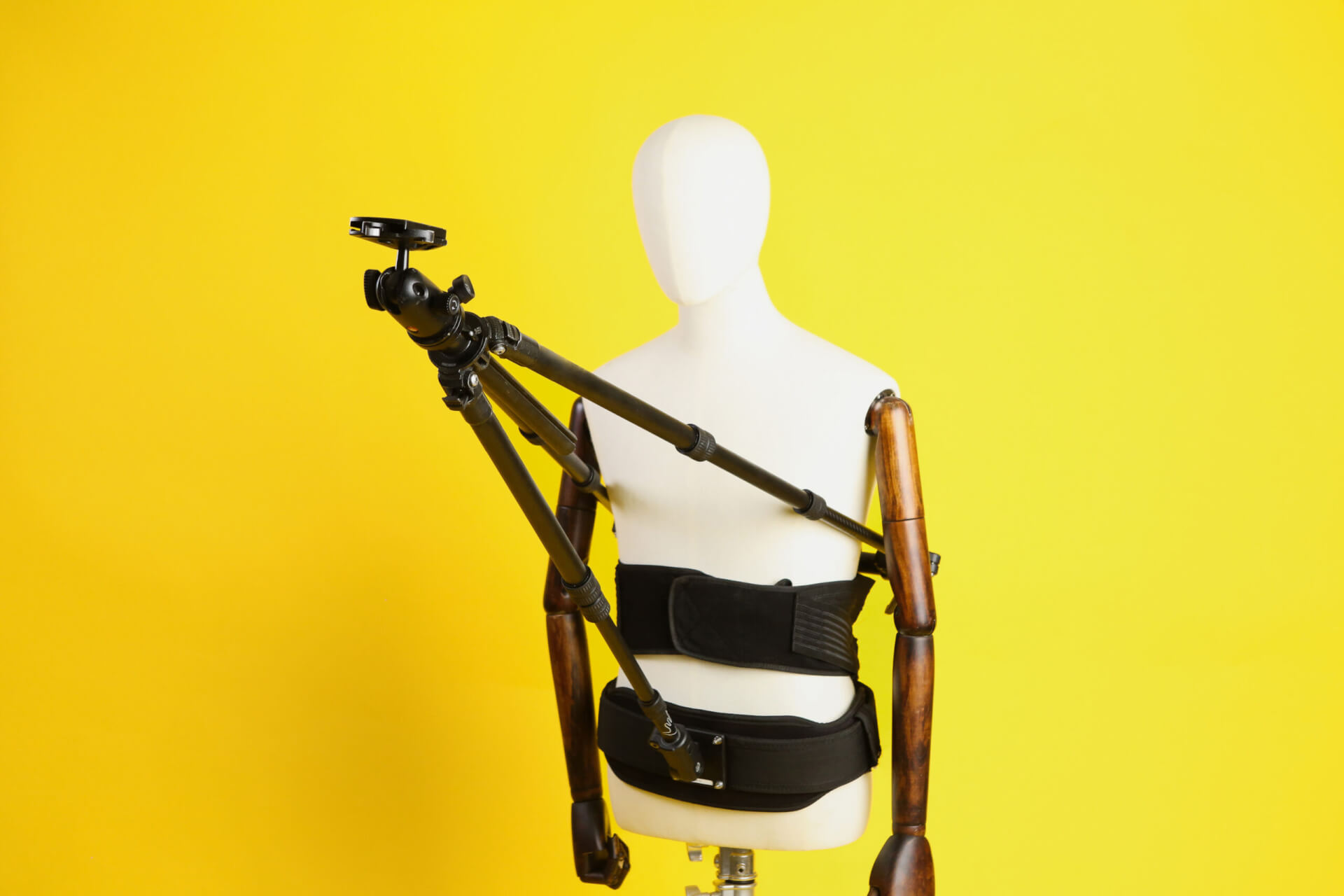 The baby body rig can take a payload of up to 5kg so you can stick anything from a GoPro to an A7s on there and you will be good to go. Utilising a strong back brace (those used in Moto MX), cleverly made into a fully supportive back/chest rig with connectors and a lightweight carbon pole tripod which extends out in front of you, the camera is mounted on a ball-head in and can be angled anyway you desire.